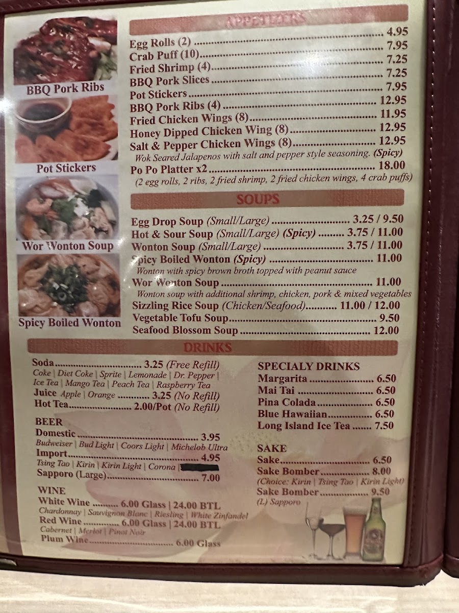 The menu offers a delightful selection that begins with tempting appetizers like crispy Egg Rolls and savory Butterfly Shrimp. The chicken dishes shine, featuring classics like Kung Pao Chicken and hearty Almond Chicken, each priced at around $9.25. Seafood enthusiasts will relish choices like Sweet & Sour Shrimp and Cashew Shrimp, priced around $10.25.